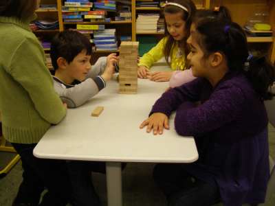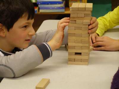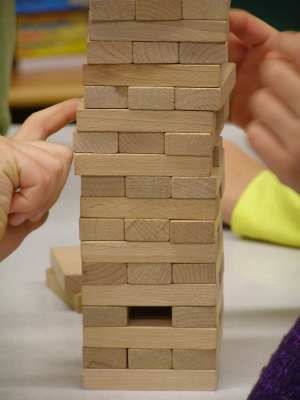 Aus dem Holzturm muss mit einer Hand ein Hölzchen herausgezogen werden, ohne dass der Turm umfällt.