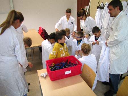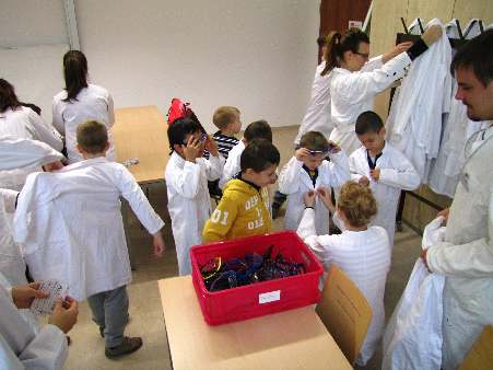 einen Laborkittel anziehen und eine Schutzbrille aufsetzen muss.