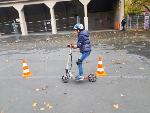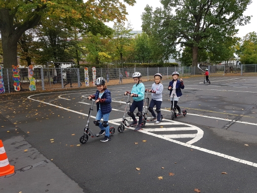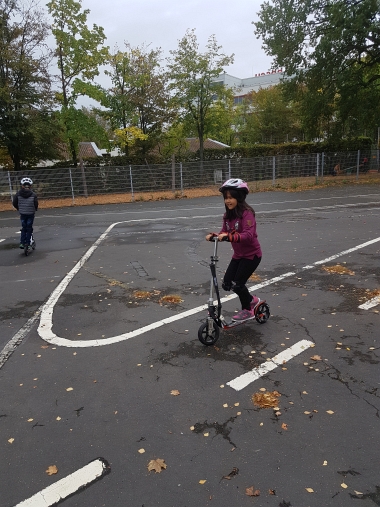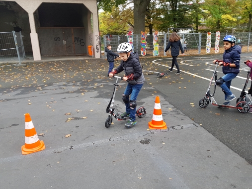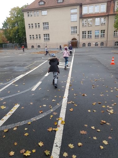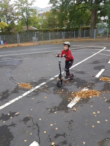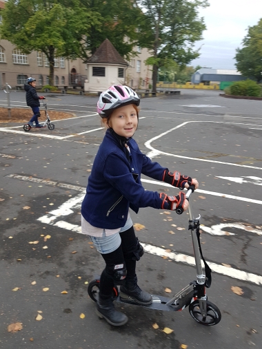 Die zweiten Klassen der Georg-Paul-Amberger-Grundschule stellten zu Beginn des Schuljahres unter Beweis, dass sie als sichere Verkehrsteilnehmer geeignet sind. Ausgerüstet mit Helmen, Knie- und Handgelenksschonern nutzten wir den Verkehrsübungsplatz auf unserem Pausenhof, um auf Rollern einfache Verkehrsregeln, Reaktionsgeschwindigkeit und gegenseitige Rücksicht im Straßenverkehr zu üben.