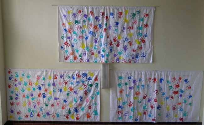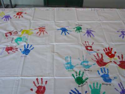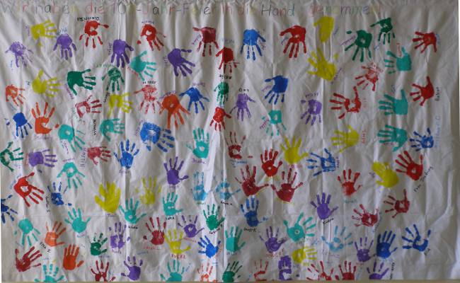 Hinterher mussten wir unsere Hände natürlich wieder gründlich sauber schrubben. Das fertige Betttuch wird im Schulhaus zum Jubiläum aufgehängt: Fotos © 2011 D. Härtl |