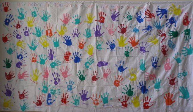ausgebreitet. Wir durften eine unserer beiden Hände mit Fingerfarben