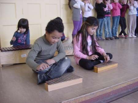 Klassen in der Aula ein, um eine gemeinsame musikalische Stunde zu