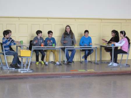 Anschließend spielte die EMU-Gruppe 2 der Klasse 4c zusammen mit Frau Kreller eine „Becherpercussion“ vor.