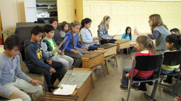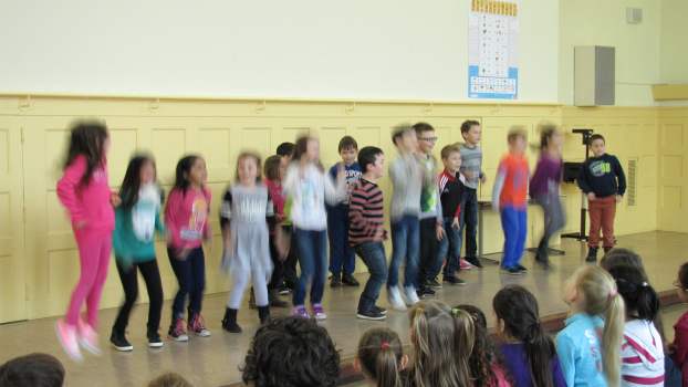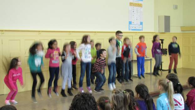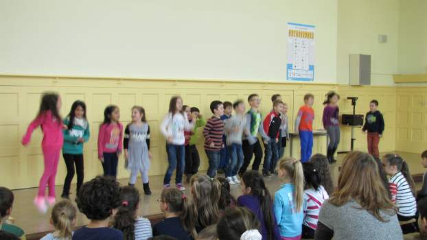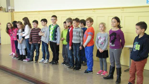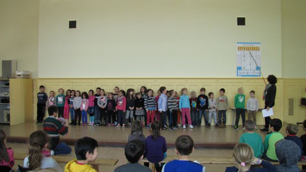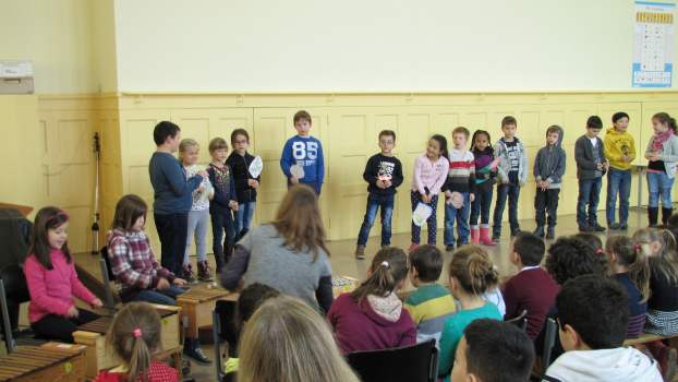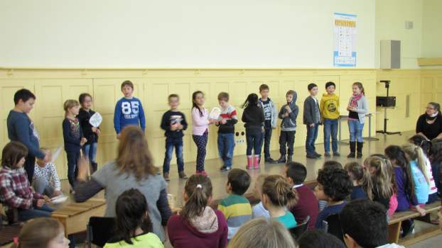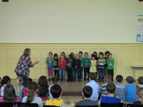 Wenn wir durch das Fenster schauen, sehen wir, dass viele Blätter schon in bunten Farben leuchten. Wer das wohl war? Natürlich der Herbst! Die Klasse 1c sang dazu das Lied "Der Herbst ist da" vor. Auch die Klassen 1a und 1b haben im Unterricht ein neues Lied gelernt und trauen sich schon, es euch auf der Bühne vorzusingen: "Der Piri-Rap". Im Herbst fallen nicht nur die Blätter von den Bäumen. Man kann auch viele Dinge ernten. Da gibt es Karotten, Kohlrabi, Tomaten und vieles mehr, die uns allen gut schmecken. Könnt ihr euch vorstellen, dass diese Gemüsearten alle zu tanzen beginnen? Nein? Dann hört euch mal das Lied "Gemüseball" an, das die Klasse 2c vorsang. Die Klasse 2b hat sich in der letzten Zeit viel mit dem ABC beschäftigt. Sie zeigte uns, dass das ABC-Lernen auch richtig Spaß machen kann. Die Klasse 2b mit dem "ABC-Lied". Zum Schluss entführten die EMU-Kinder der Klasse 4c noch ins warme Spanien. Dort gibt es eine Gegend, die Andalusien heißt. Die Schüler spielten dazu verschiedene Xylophone. Das Spielstück "El Andaluz" mit der Klasse 4c.