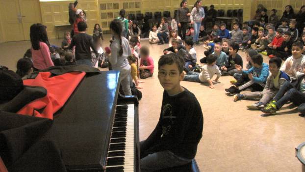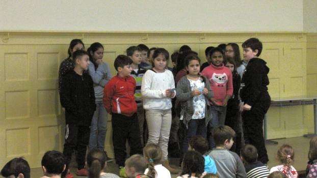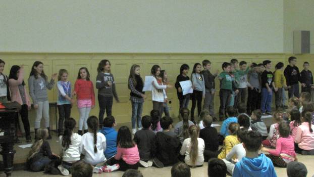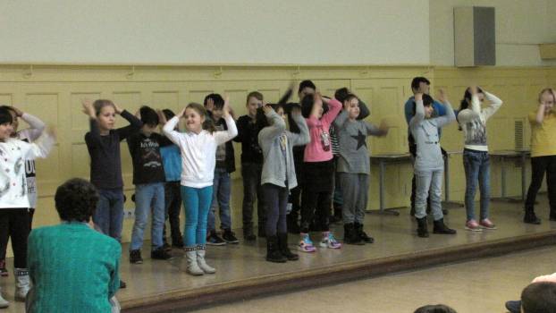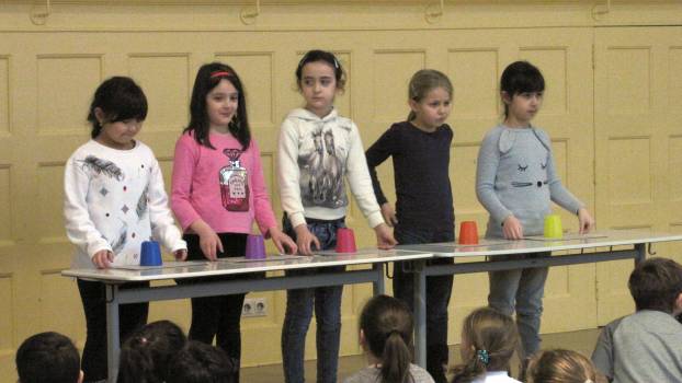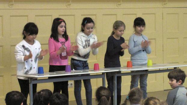 Zur Eröffnung sangen wir alle das Monatslied der Ambergerschule "Delfin Hugo". Anschließend präsentierte die Klasse 1a das "Lasso-Lied". Zum Mittanzen forderte die Klasse 2b bei dem Song "Macarena" auf: Noch einmal 5 Kinder aus der Klasse 2b präsentierten geschickt mit Bechern den "Cup-Song": Einen "English Rhyme" mit selbst gestalteten Grafiken führte die Klasse 3b auf: Das schöne historische Lied "Die Gedanken sind frei" sang die Klasse 4d: Zum Abschluss brachte ein Schüler aus der Klasse 4a "Für Elise" zu Gehör: Fotos © 2016 S. Kraft |