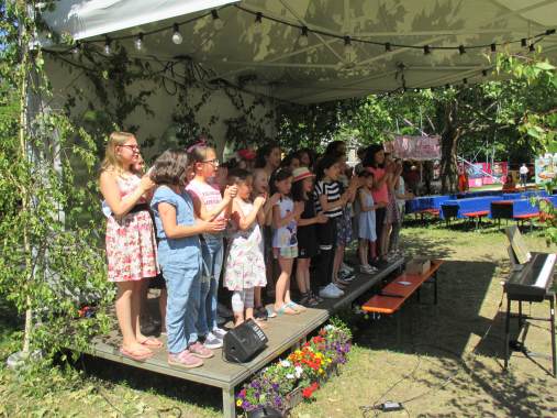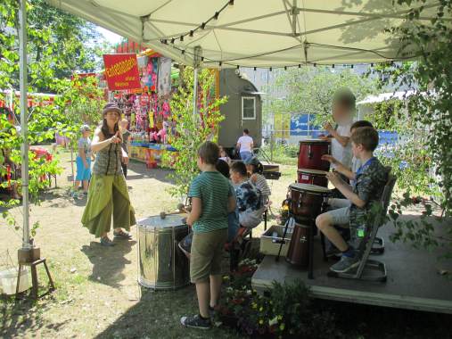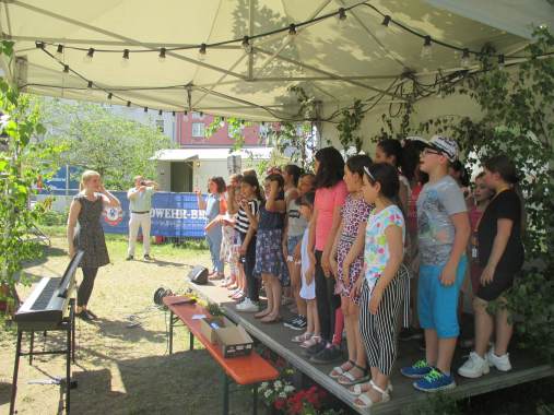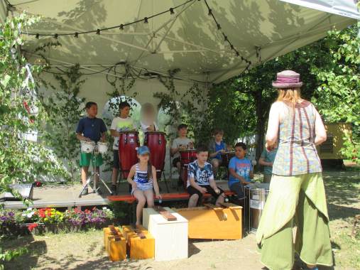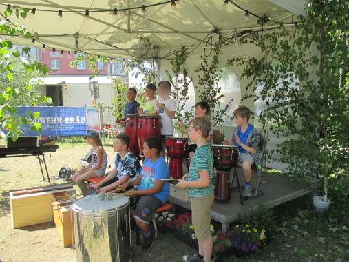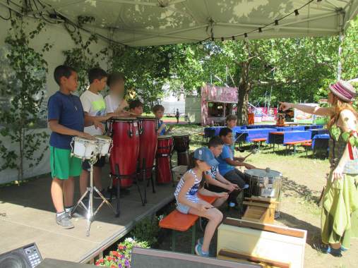 Wie jedes Jahr traten am Kärwa-Montag in Schweinau der Chor und die Percussion-Gruppe der Schule auf. Trotz großer Hitze sangen und trommelten die Kinder begeistert. Eltern und Freunde kamen zum Zuhören. Dank der Kärwa-Organisatoren gab es zur Belohnung ein kühles Getränk und eine Freifahrt.