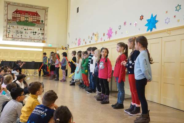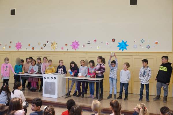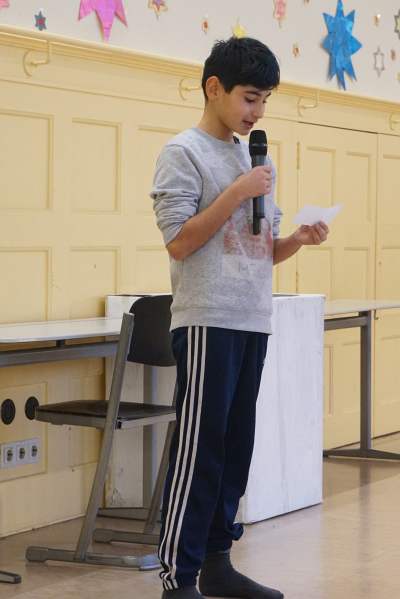 Als nächstes möchte ich die Kinder der Klasse 4d auf die Bühne bitten, die das Gedicht „die Schneewolke“ und das kleine szenische Spiel „Das Gewicht der Schneeflocke“ für euch vorbereitet haben. Vielen Dank für diesen Weihnachtssong. Nun hört ihr von den Kindern der Klasse 2a das Gedicht: „Was wird das neue Jahr mir bringen?“ Vielen Dank an die Kinder der 2a. Nun bitte ich die Klasse 2c auf die Bühne mit ihrem Lied „Ich kann nicht mehr warten.“ Vielen Dank an die Kinder der Klasse 2c. Mit einem schönen Wunsch auf Englisch wird die Klasse 4c unsere heutige Monatsfeier abschließen. Viel Spaß bei diesem letzten Lied. Fotos © 2019 dh, Text: es |