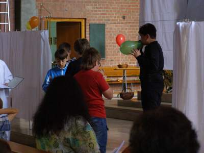 Aber Zachäus wandte sich an den Herrn und sagte zu ihm: »Herr, ich verspreche dir, ich werde die Hälfte meines Besitzes den Armen geben. Und wenn ich jemand zu viel abgenommen habe, will ich es ihm vierfach zurückgeben.« Darauf sagte Jesus zu ihm:»Heute ist dir und deiner ganzen Hausgemeinschaft die Rettung zuteil geworden! Auch du bist ja ein Sohn Abrahams. Der Menschensohn ist gekommen, um die Verlorenen zu suchen und zu retten.« Symbol Luftballon: Kann schlaff zu Boden fallen, aber auch zum Himmel hochsteigen. Fürbitten: Vielen Dank an das Vorbereitungsteam (Frau Berger, Frau Jäger, Herr Janus) sowie an alle mitwirkenden Kinder!