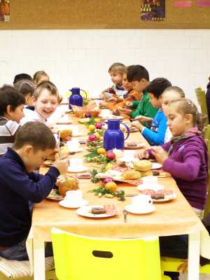 Frühstück an adventlich geschmückten Tischen in unserem „Treffpunkt Schulküche“