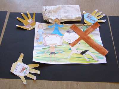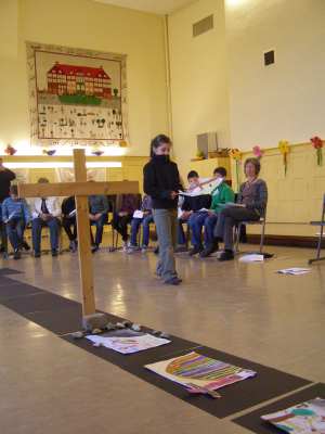 anwesenden Kindern und Erwachsenen den schweren Weg, den Jesus bis zu