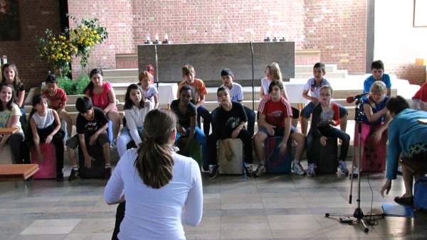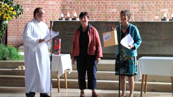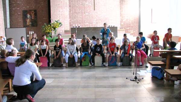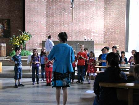 Viertklässler und Frau Berger tragen Fürbitten vor.
